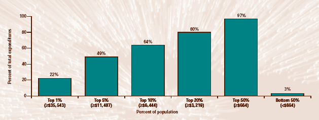 In one study, the Department of Health and Human Services found that “half of the population spends little or nothing on health care, while 5 percent of the population spends almost half of the total amount.” In 2002, the top 5% accounted for 49 percent of overall health spending, or roughly $11,487 per person, while the bottom 50% accounted for only 3% of total spending at a cost of $664 per person. The same study finds that “the elderly (age 65 and older) make up around 13% of the U.S. population, but they consumed 36% of total… expenses.”
